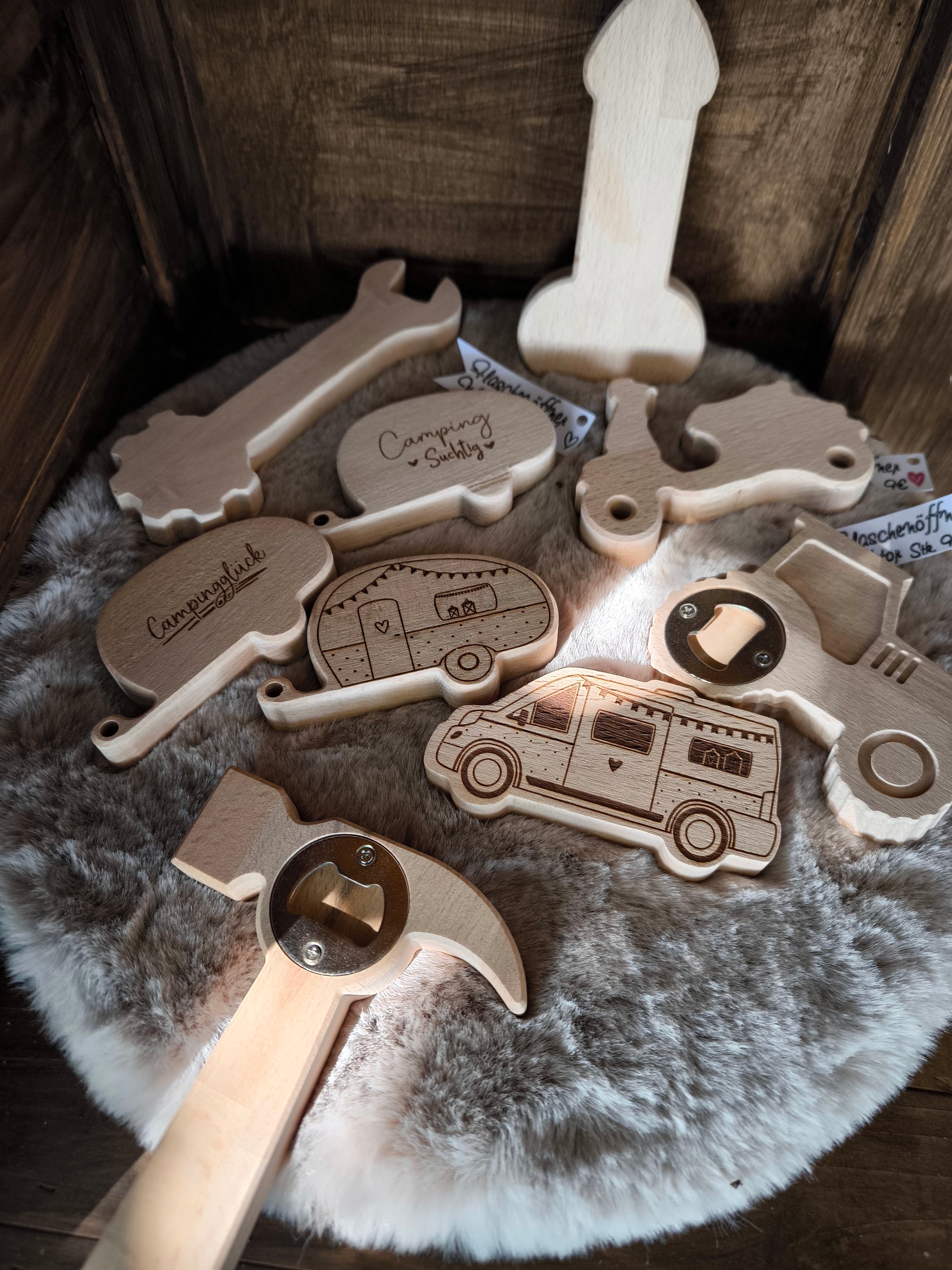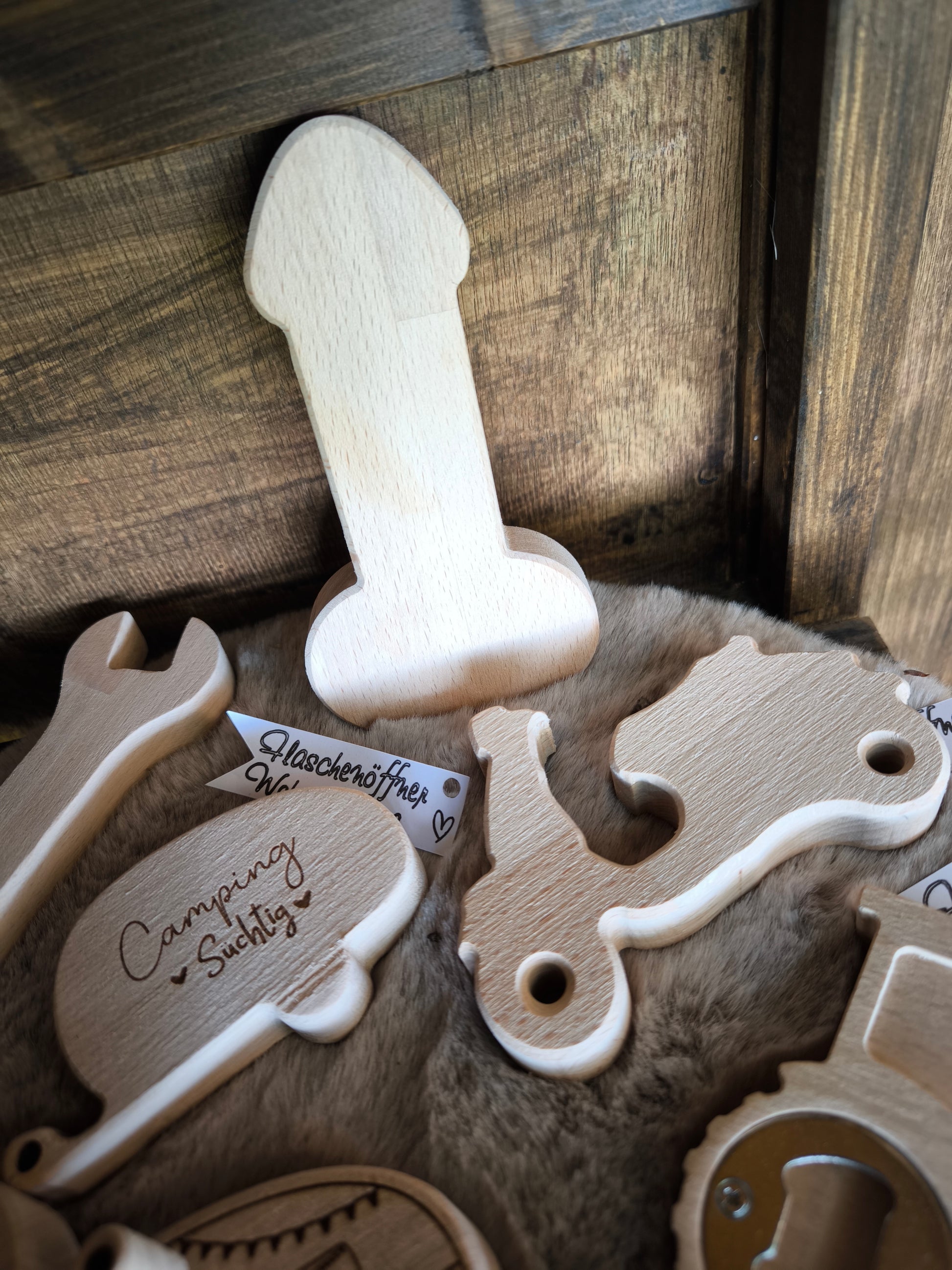 Die Flaschenöffner sind handgefertigt & bestehen aus Buchenleimholz, ausser die Wasserwaage ist aus Bambusholz.